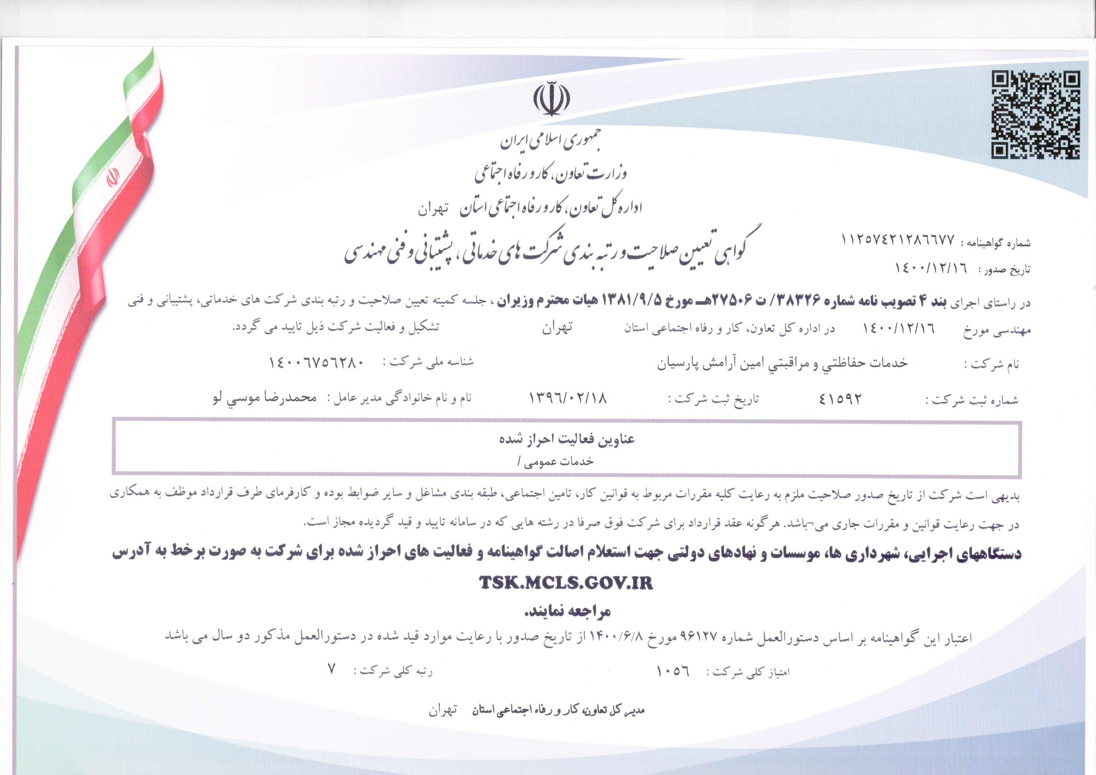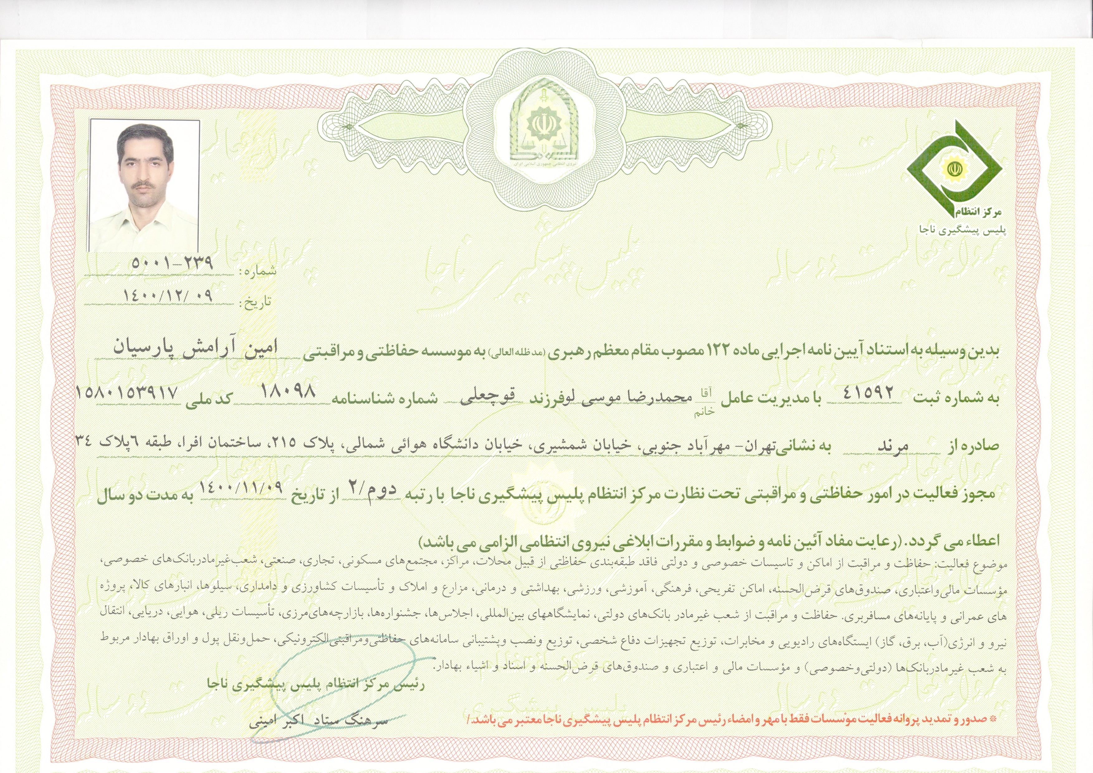 موسسه خدمات حفاظـتی و مراقبتی امین آرامش پارسیان با تاییدات خداونـد متعـال و در اجرای ماده 122قانون برنامه چهـارم توسعه اقتصادی اجتماعی و فرهنگی به منظور ارتقاء ظرفیت و توان نیروی انتظامی جمهوری اسلامی ایران در پیشگیری از وقوع جرایـم و ارایه خدمات انتــظامی و حفاظتی و مراقبتی به مردم ، به شماره 41592 در اداره ثبت شرکتـها ثبت و با مجـوز شماره 238-5001 صادره از مرکـز انتـظام پلیس پیشـگیری ناجـا شروع به فعالیت نمود.