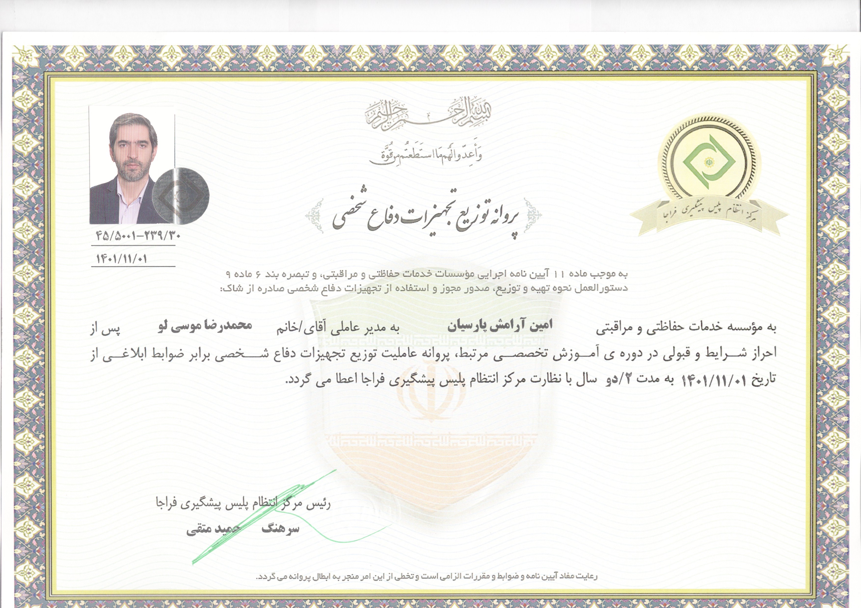 فروش تجهیزات دفاع شخصی از جمله خدماتی است که در مؤسسه حفاظتی مراقبتی امین آرامش پارسیان برای افراد حائز شرایط ارائه می گردد در این طرح متقاضیان می توانند از شوکر و افشانه به همراه مجوز و بیمه نامه برای استفاده در مواقع اضطراری و دفاع از خود بهره برداری نمایند.